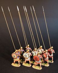 Each phalangite carried as his primary weapon a Sarissa, a double pointed pike over 18 foot in length. The Sarissae were carried in two pieces before a battle and then slid together when they were to be used. At close range such weapons were of little use, but an intact phalanx could easily keep its enemies at a distance. The weapons of the first few rows of men all projected beyond the front of the formation, so that there were more spear points than available targets at any given time.