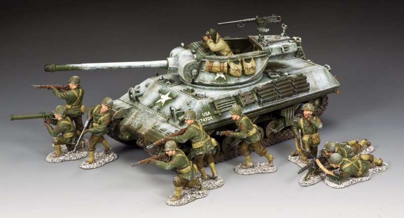 This 3-man section is carrying probably the finest infantry rifle of WW2... The M1 ‘Garand’, the .30-06 calibre, semi automatic weapon that was the standard US Army service rifle of WW2. This weapon was so good that it also saw service in Korea (1950-53) and even limited service during the early part of the Vietnam War with the South Vietnamese Army. When the rest of the WW2 participants were using bolt-action rifles the GI’s had the advantage of being able to fire off an eight round clip in quick succession without having to move their hands on the rifle and disrupt their firing position and point-of-aim. The M1 ‘Garand’ was also designed for simple assembly and disassembly and could be ‘field-stripped’ in just a few seconds. Strong, sturdy and reliable it was the GI’s best friend in all weathers and conditions.